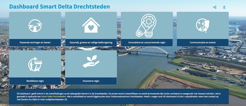 Dit dashboard is door Onderzoekcentrum Drechtsteden ontwikkelt in opdracht van en in samenwerking met Smart Delta Drechtsteden. Het bevat de laatste informatie over de Drechtsteden op het gebied van de woningmarkt, arbeidsmarkt, onderwijs, innovatie en concurrentievermogen, bereikbaarheid en duurzaamheid. Elk kwartaal worden de nieuwste cijfers aangevuld.